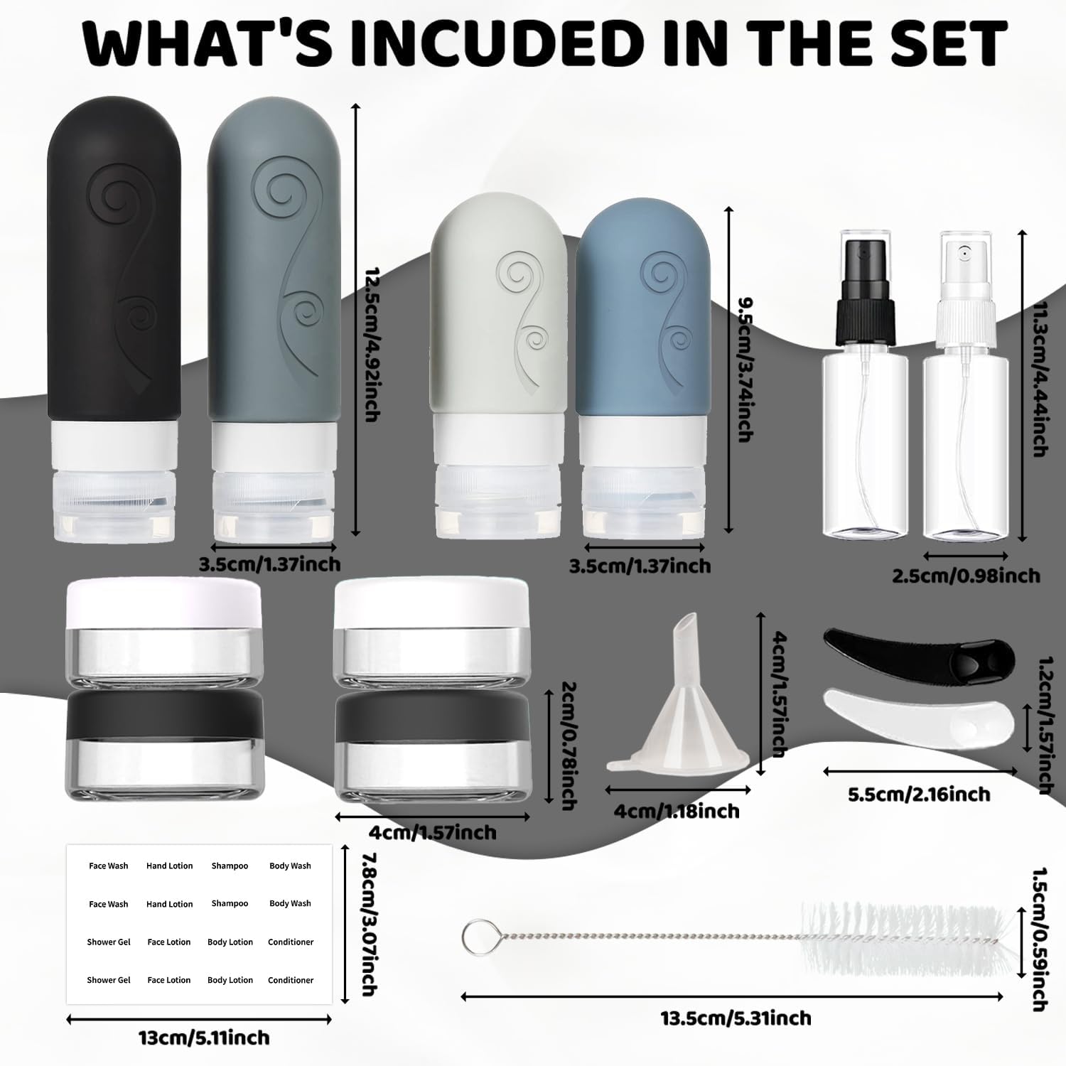 Consists of 4 bottles, 4 jars, 2 spray bottles, scoopers, funnel, brush, label and bag for organizing toiletries