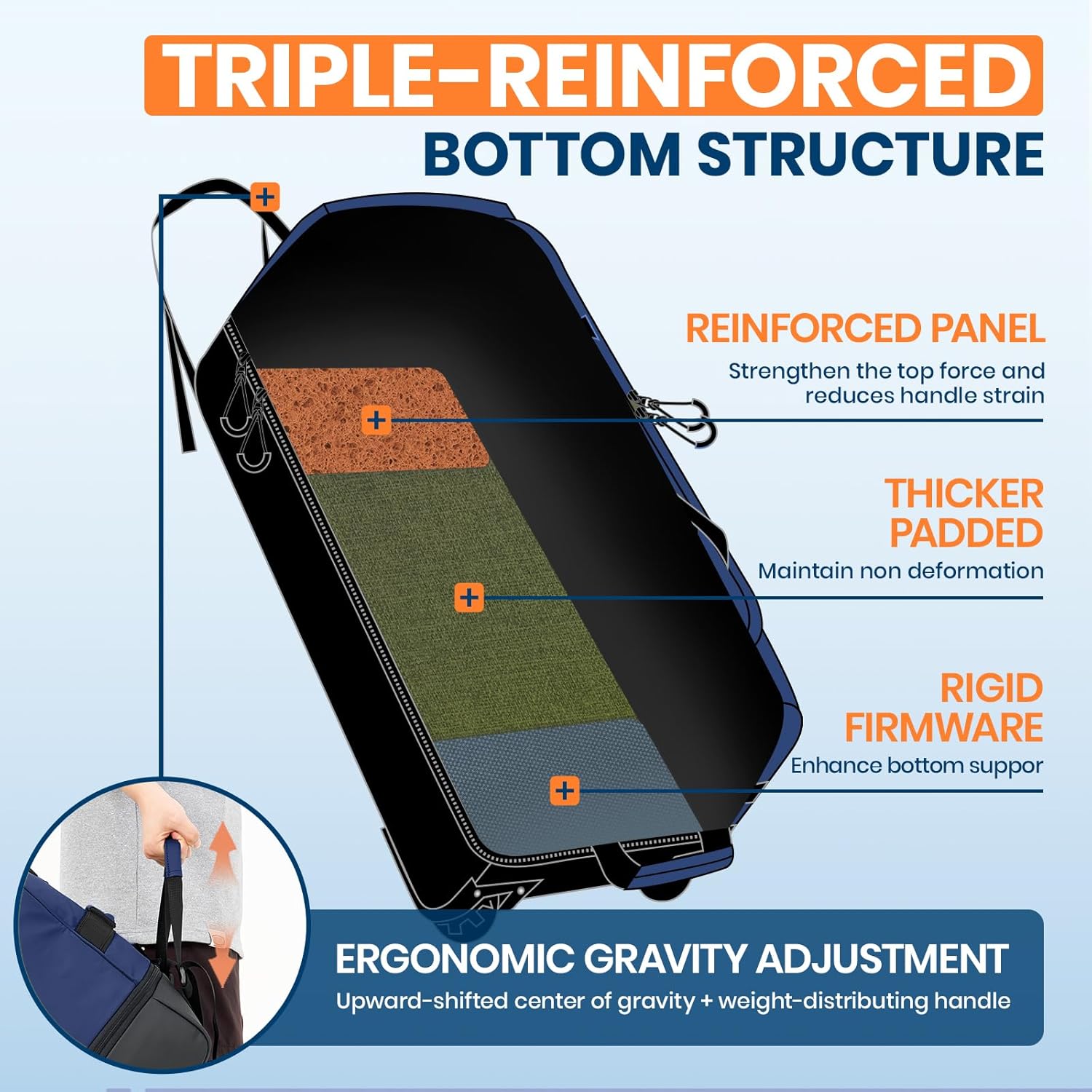 Steady Journey Assistant: This duffel bag redefines design with innovation, upgrading the help construction to forestall deformation.Why is it extra reliable? Its triple-reinforced backside ensures firmness when totally loaded, fixing widespread sagging and dragging points. Ergonomically adjustable deal with hook up with the strengthened base, enhancing load-bearing capability, shifting the middle of gravity upward, and distributing weight for easy. Allow you to simply pull in essentially the most snug posture