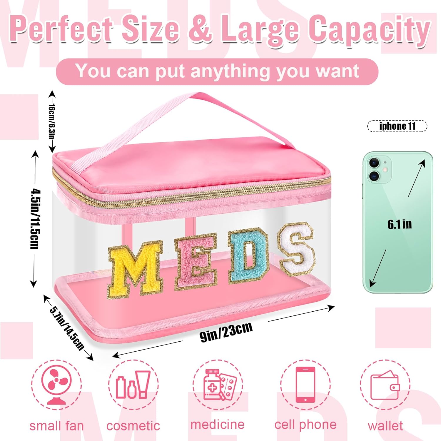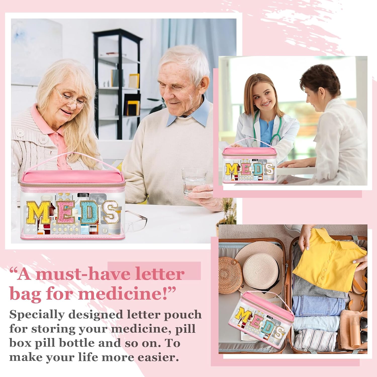 Chenille Letter Bag Clear MEDS Make-up Pouch, Waterproof Moveable Medication Bag for Touring Preppy Small Meds Bag Zipper Pouch with Deal with, Nylon Medication Toiletry Organizer for Affected person Nurse(MEDS-Pink)
