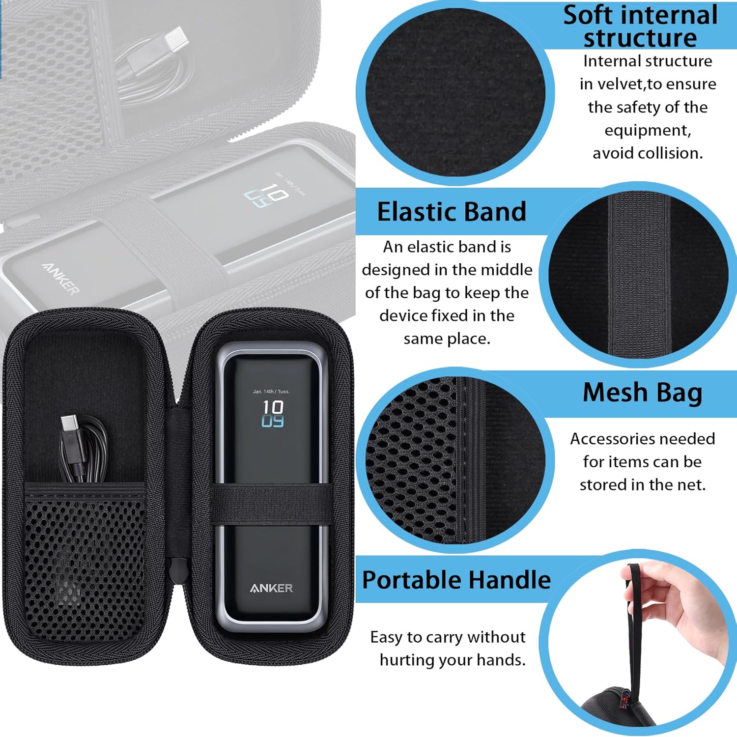 【Enhanced Safety Inside and Out】The inflexible EVA shell shields your Anker Prime 20,100mAh Energy Financial institution, Anker Prime Energy Financial institution 20,000mAh 200W from drops and compression. Inside, the tender velvet lining prevents scratches and cushions the gadget. The cosy match ensures your Anker prime 220w(A110B) stays securely in place. Constructed for long-term use, the case presents sturdiness for each the shell and the deal with.