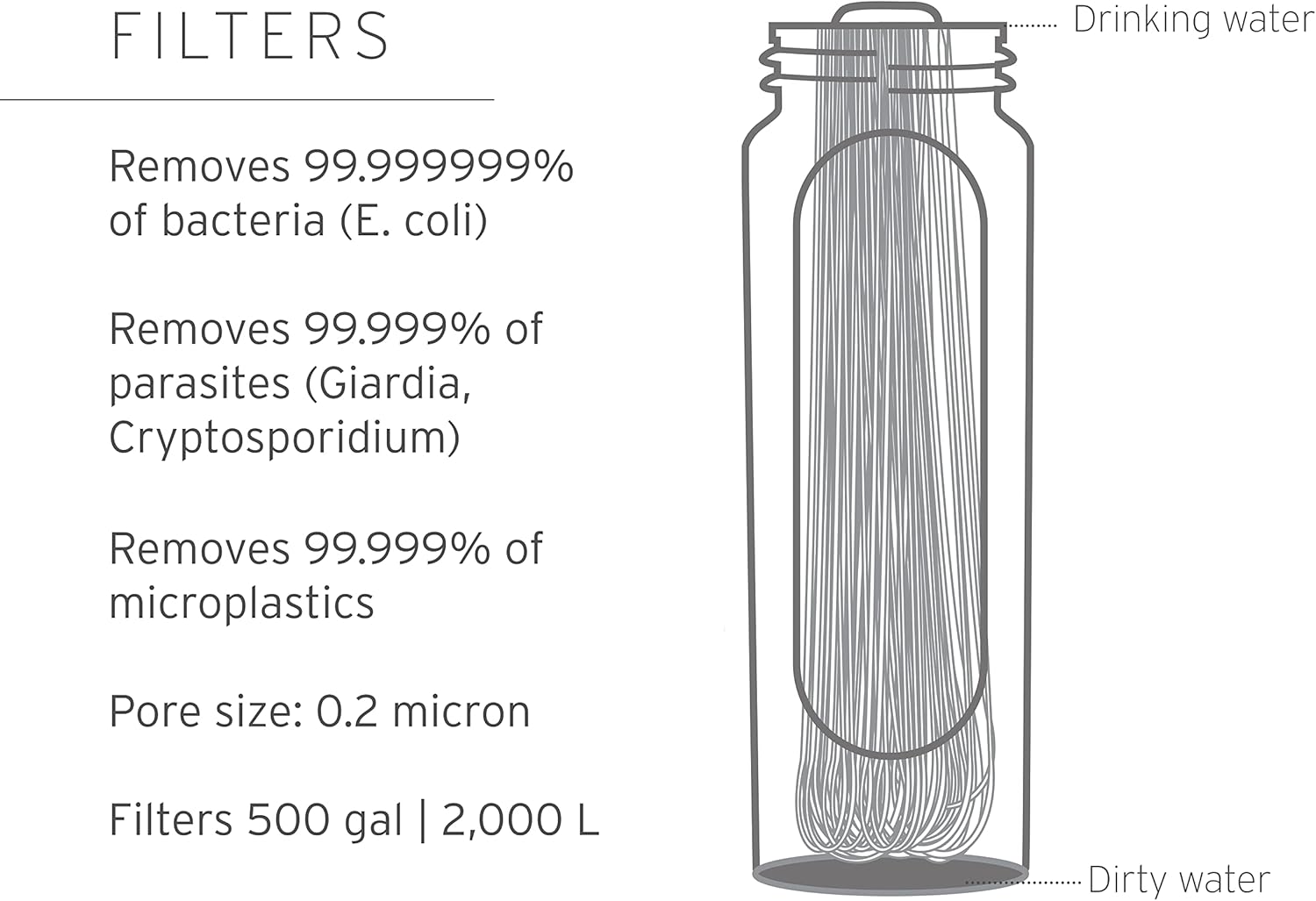 Protects in opposition to 99.999999% of micro organism (together with E.coli, Salmonella), 99.999% of parasites (together with Giardia and Cryptosporidium), 99.999% of microplastics, silt, sand, and cloudiness