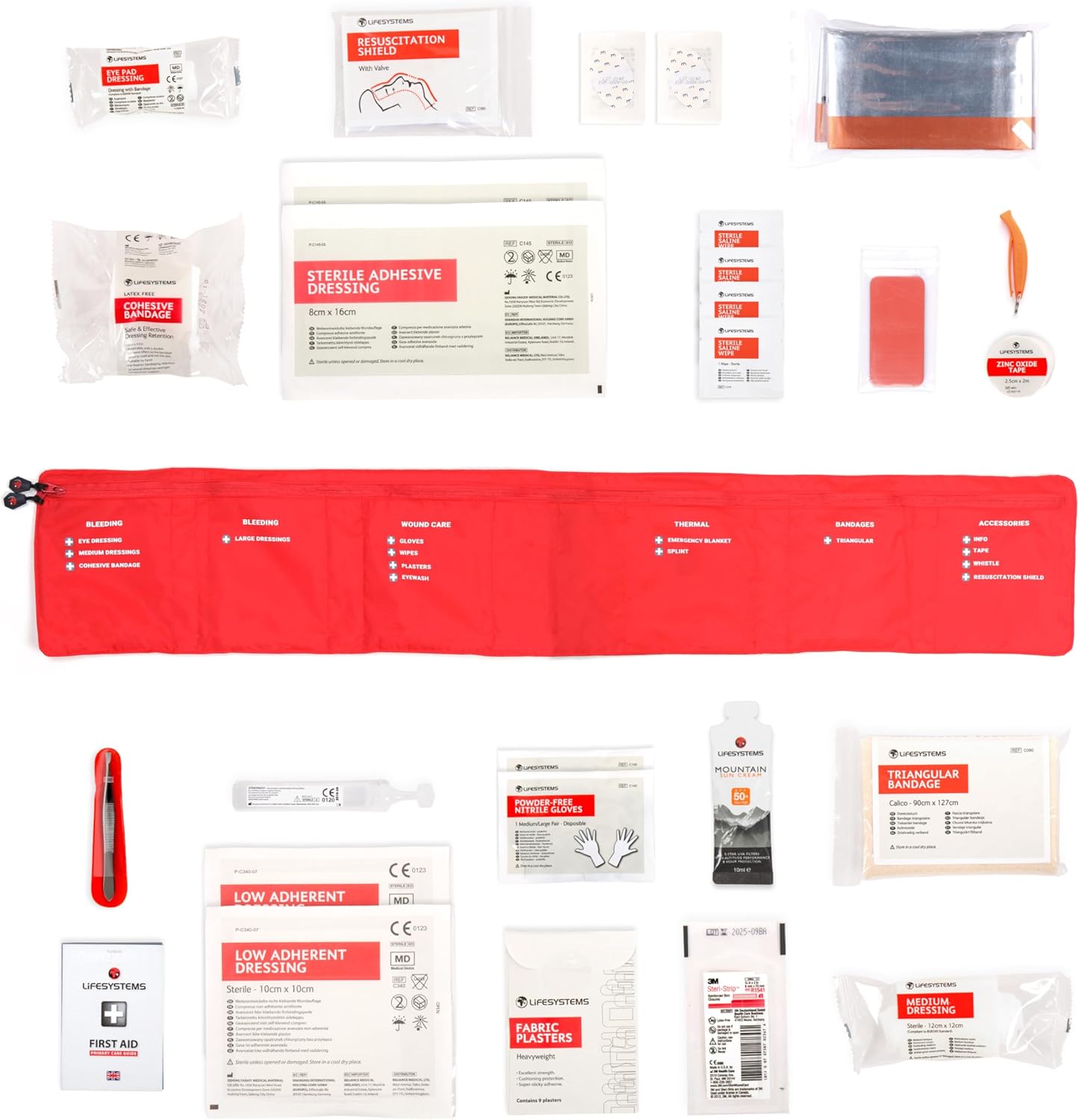 3 x Wound Closure Strips, 4 x Sterile Saline Wipes, Major Care Leaflet, Zinc Oxide Tape (2m), Solar Cream Sachet, Flexi-Finger Splint, Resuscitation Help, Tweezers, Whistle, 2 Pairs of Nitrile Gloves, Thermal Blanket, Sterile Eye Wash (20ml)