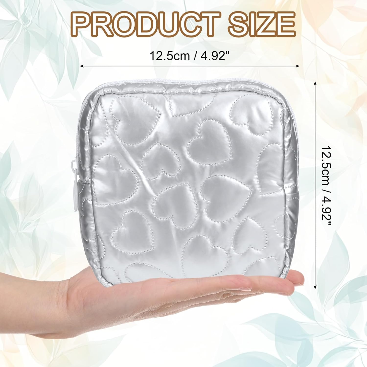 Materials: PU; Shade: Silver; Dimension: 12.5 x 12.5 x 4 cm / 4.92 x 4.92 x 1.57 inch(L*W*H); Packing Checklist: 1 Pcs x Beauty Zipper Pouch Purse