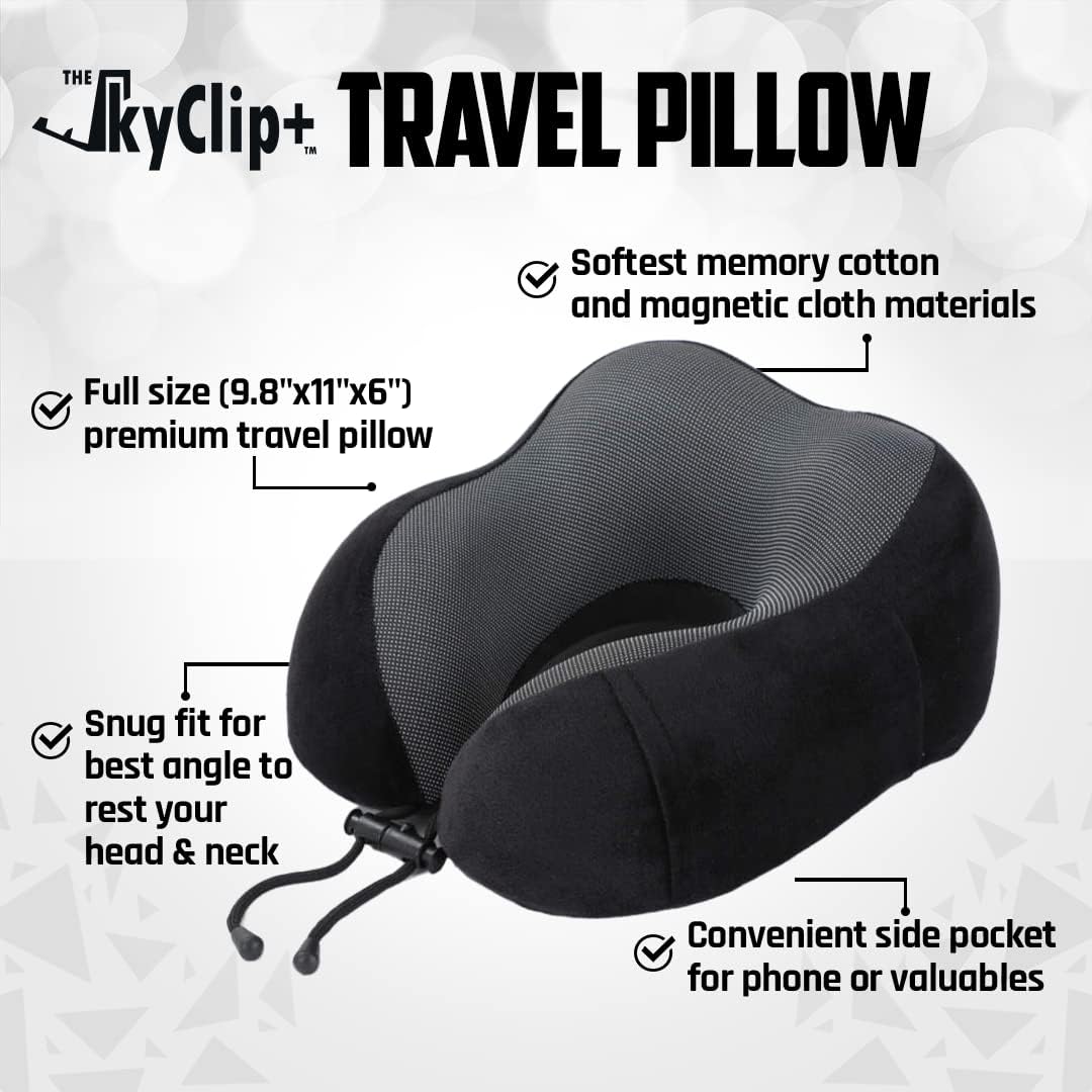 The SkyClip+ Travel Neck Pillow Set – Airplane Travel Kit with Memory Foam Neck Pillow, Eye Mask, Earplugs, Inflight Phone and Tablet Holder Clip – Soft and Breathable Airplane Pillow for Sleeping