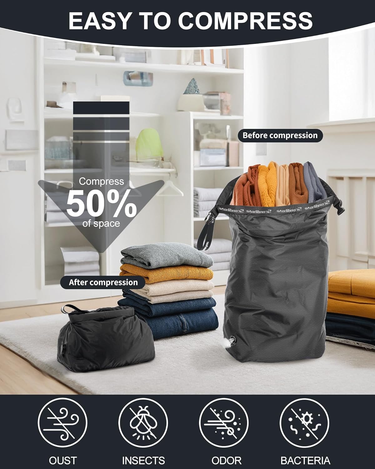 Options: Foldable, pump-free compression, washable, reusable, multi-purpose