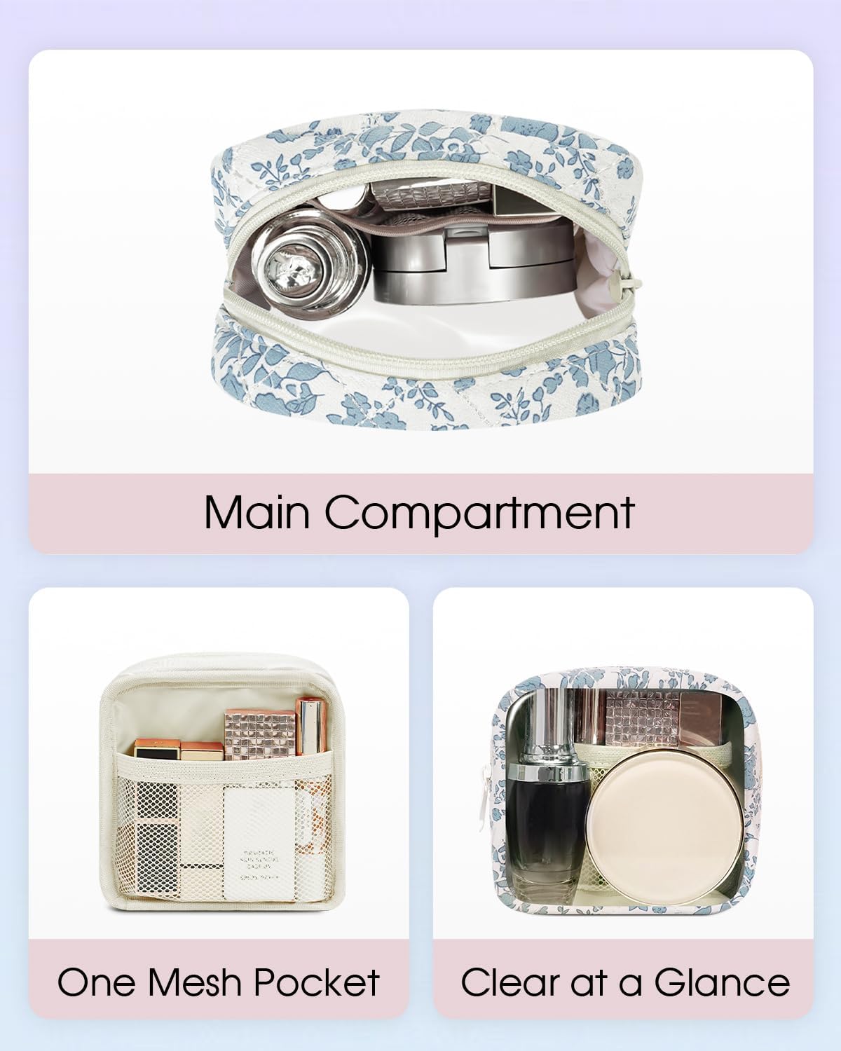 Wandering Nature Clear Make-up Bag for Purse Mini Make up Bag Cute Beauty Pouch for Ladies with Slip-in Pockets Journey Toiletry Necessities Organizer Pouch,Blue Flower
