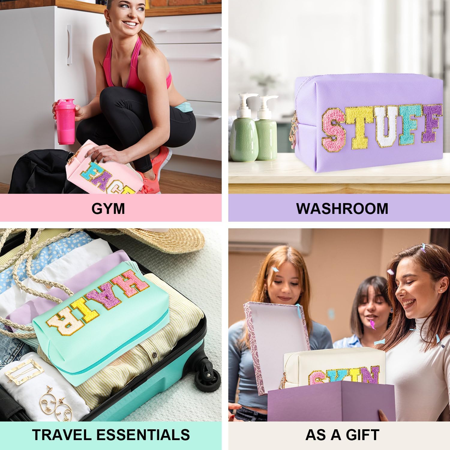 【Glitter Chenille Letters】The preppy beauty bag has gold glitter letter patches.The phrases on the floor will help you classify totally different objects.
